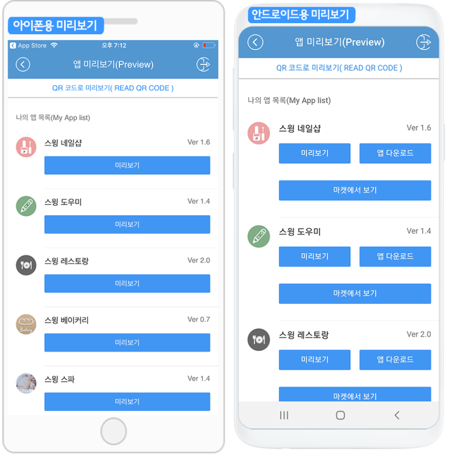 해당 메뉴는 관리자나 부관리자로 로그인하지 않아도, 앱 마다 제공되는 QR코드를 스캔하여 핸드폰에서 앱을 미리볼 수 있습니다.
